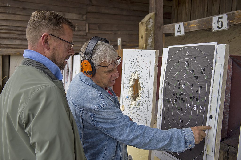 - Kurzwaffe (Revolver oder Pistole) – 5 Schuß auf Zielscheibe 25 Meter im Stehen. Davon müssen mindestens 2 Schuß irgendwo auf der Zielscheibe treffen.